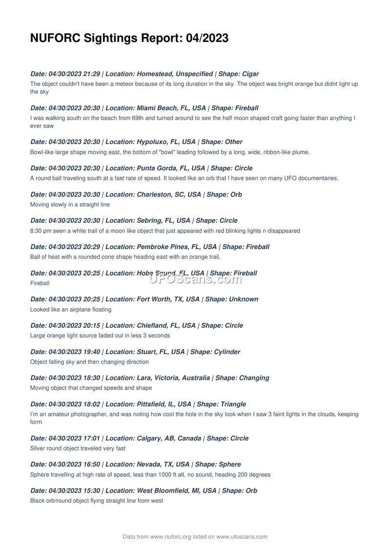 NUFORC Sightings Report: 04/2023