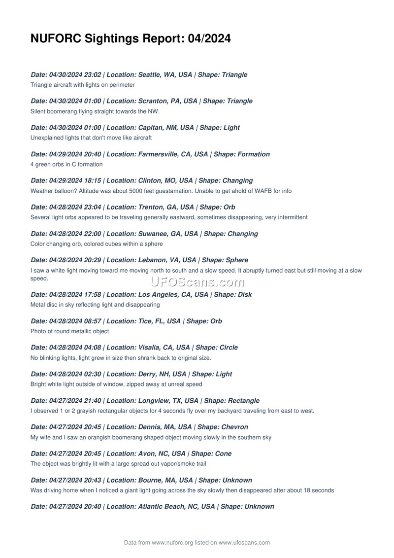 This document is a monthly log of UAP sightings reported to the National UFO Reporting Center in April 2024. It provides a chronological record of witness accounts from around the world, detailing various object shapes, behaviors, and observational contexts.