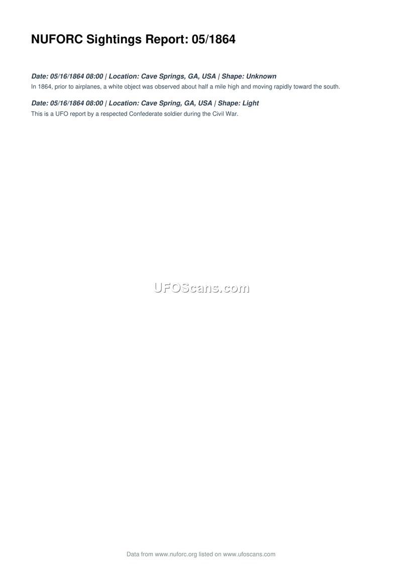 A report from NUFORC detailing a 1864 sighting of a white object by a Confederate soldier in Cave Springs, Georgia. The object was observed at half a mile altitude moving rapidly south.
