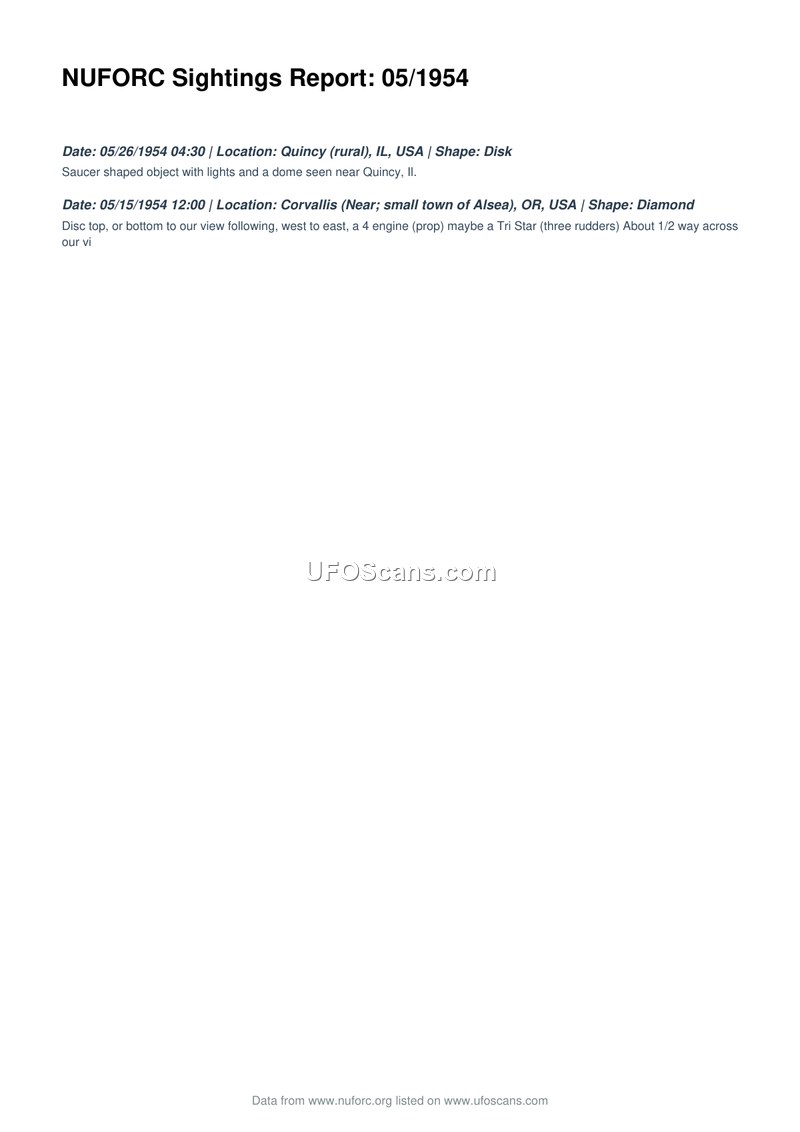 This document is a compilation of two UFO sightings reported to the National UFO Reporting Center (NUFORC) occurring in May 1954. The first incident took place on May 26, 1954, at 04:30 near Quincy, Illinois. The witness described a saucer-shaped object featuring lights and a dome. The second incident occurred on May 15, 1954, at 12:00 near Alsea, a small town near Corvallis, Oregon. The witness observed a diamond-shaped object with a disc top or bottom. The object was described as moving from west to east and was noted to have four engines, possibly resembling a Tri Star aircraft with three rudders.