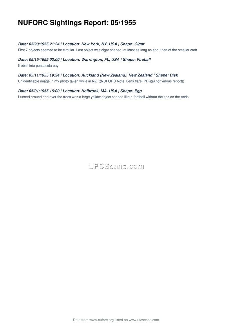 This document lists four UFO sightings reported to the National UFO Reporting Center during May 1955. It includes descriptions of various shapes, including cigar, fireball, disk, and egg-like objects.