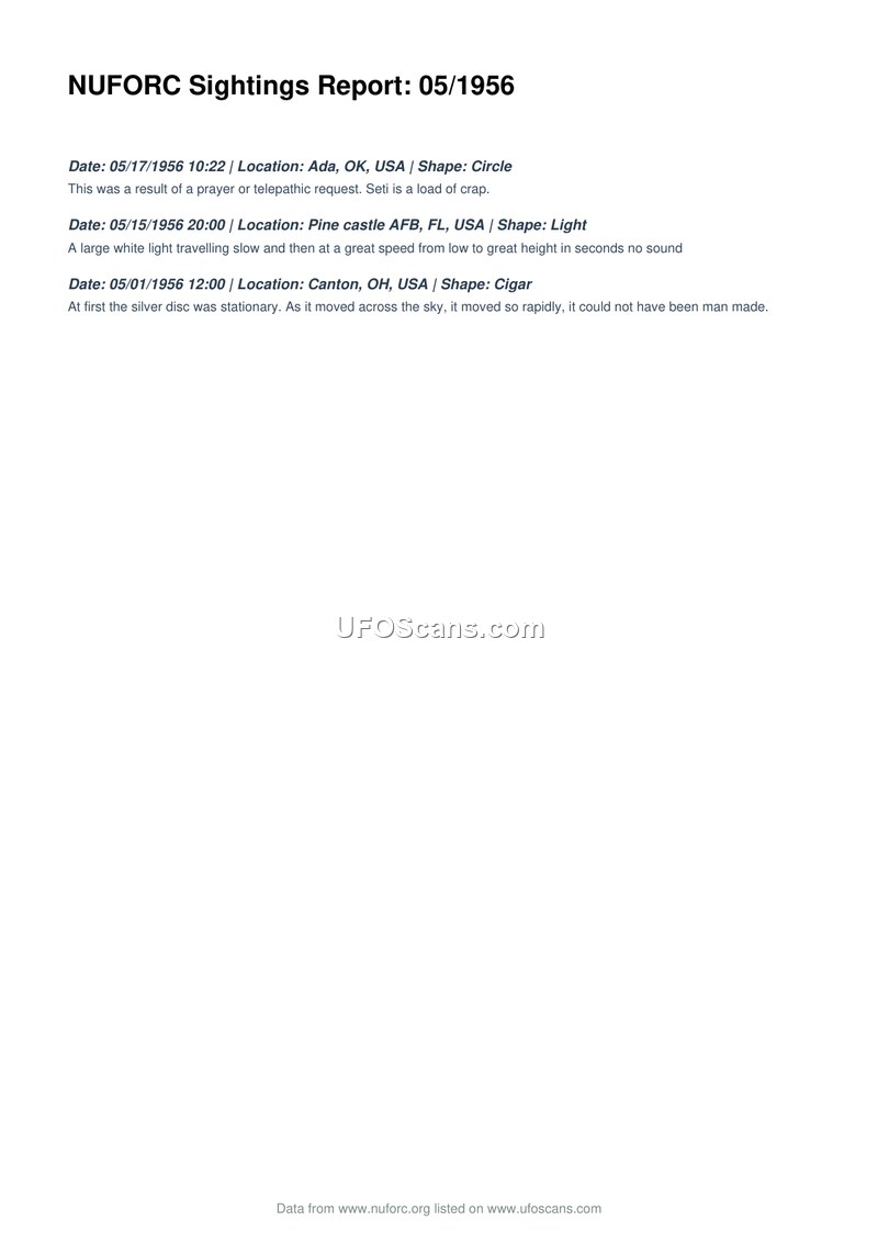 This document is a compilation of three UFO sightings reported to the National UFO Reporting Center (NUFORC) for the month of May 1956. The first entry, dated May 17, 1956, describes a circular object seen in Ada, Oklahoma, with the observer attributing the event to a prayer or telepathic request. The second entry, dated May 15, 1956, details a large white light observed at Pine Castle AFB, Florida, which moved from a low altitude to a great height at high speed without making any sound. The final entry, dated May 1, 1956, concerns a cigar-shaped object seen in Canton, Ohio. The witness reported that the object was initially a stationary silver disc before moving rapidly across the sky, leading the observer to conclude it could not have been man-made.