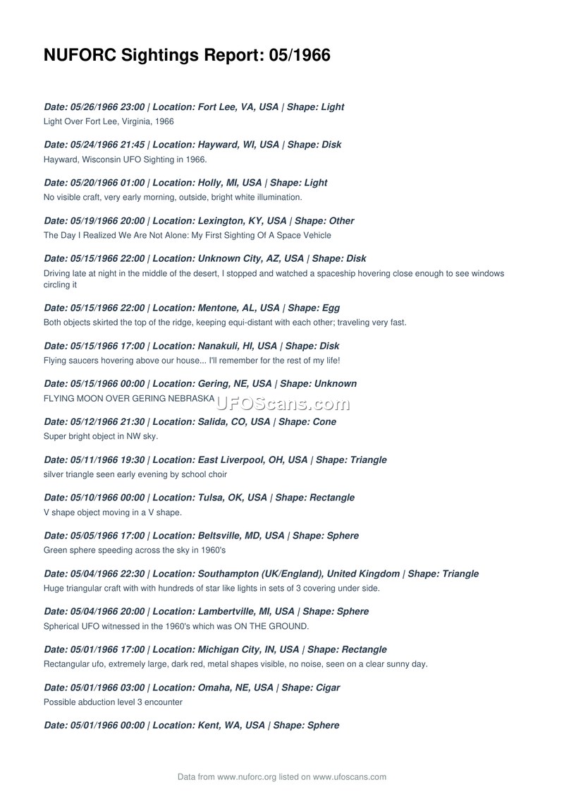 NUFORC Sightings Report: 05/1966