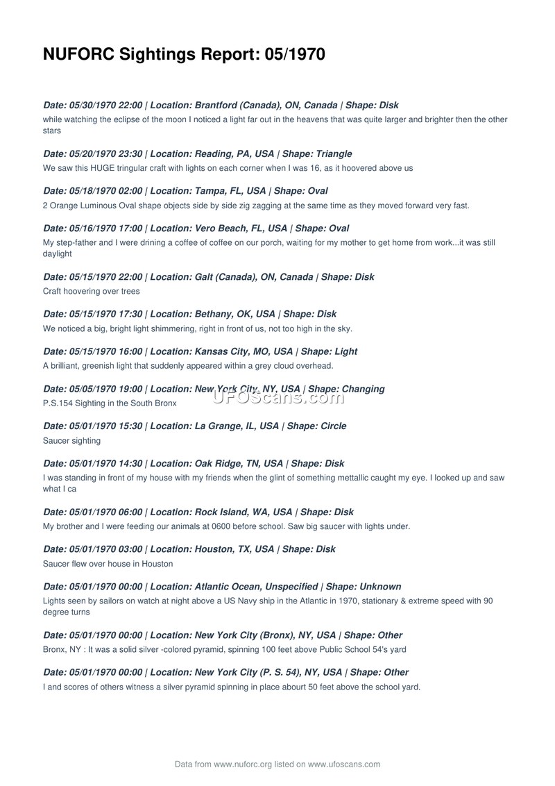 This document is a compilation of UFO sighting reports from May 1970, sourced from the National UFO Reporting Center (NUFORC). The report lists fourteen distinct incidents occurring across North America and the Atlantic Ocean. The sightings describe a variety of shapes, including disks, triangles, ovals, circles, and pyramids, as well as unidentified lights. Notable reports include a sighting by sailors over a US Navy ship in the Atlantic involving extreme speed and 90-degree turns, and multiple reports of a silver pyramid spinning above a school yard in the Bronx, New York. Other incidents involve witnesses observing objects while performing daily activities, such as feeding animals or drinking coffee. The descriptions range from simple light observations to more complex maneuvers, such as zig-zagging and hovering.