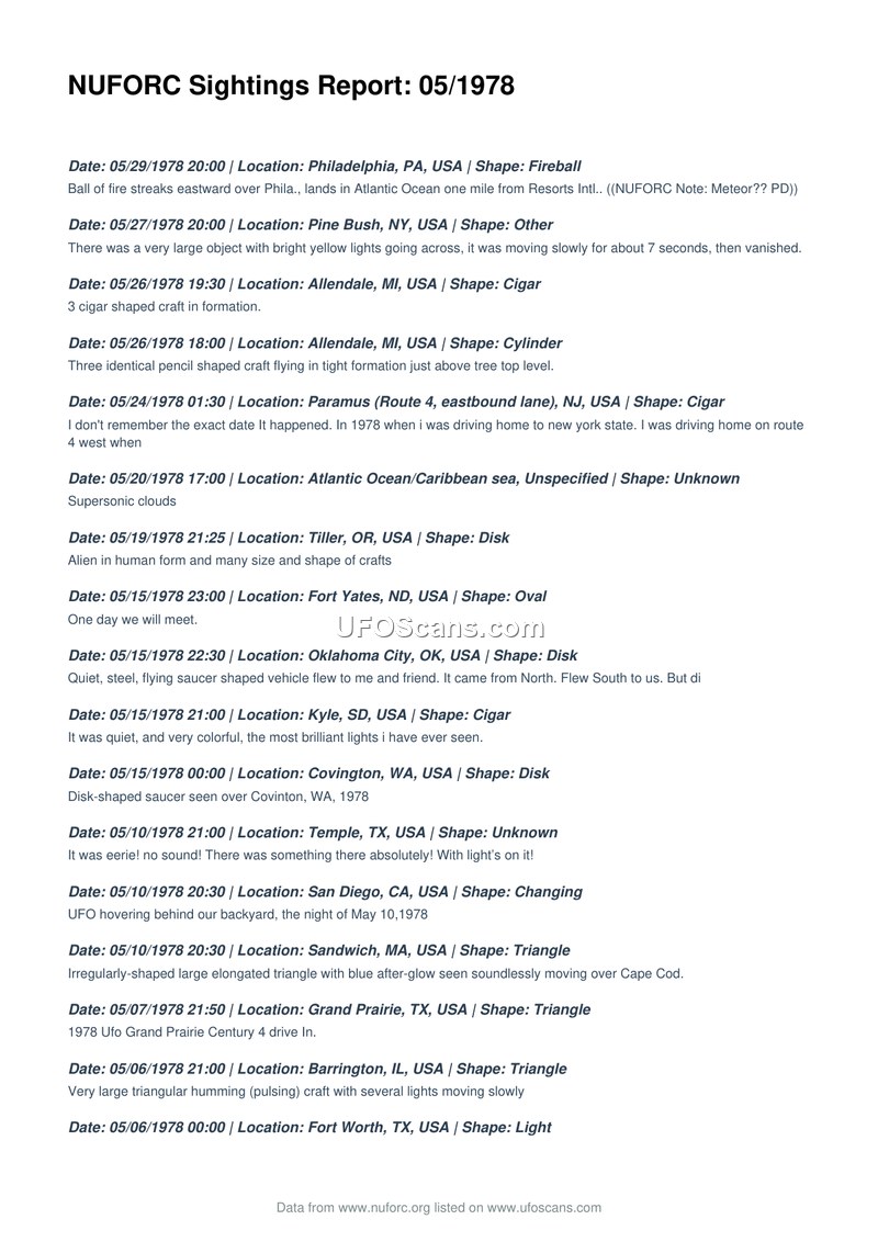 This document is a chronological list of UFO sightings reported to NUFORC during May 1978. It provides a summary of various aerial phenomena observed across the United States, ranging from light displays to structured craft.