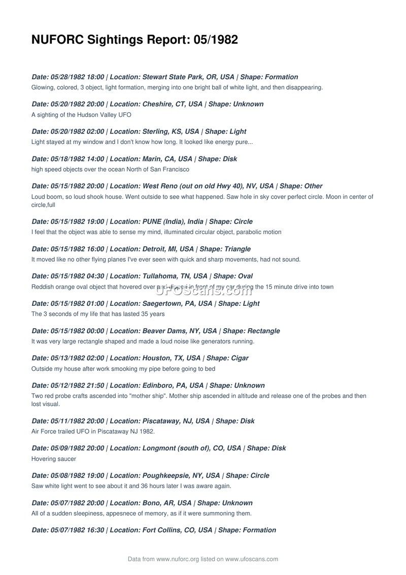 This document is a compilation of UFO sighting reports from May 1982, sourced from the National UFO Reporting Center (NUFORC). The report lists various incidents occurring globally, including locations in the United States, India, and Germany. The sightings describe a wide range of phenomena, including glowing formations, high-speed disks, triangular objects, and cigar-shaped craft. Several reports involve specific details such as loud booms, perceived telepathic communication, missing time, and interactions with military installations, such as the Bangor submarine base. One report specifically mentions an Air Force encounter with a UFO in Piscataway, New Jersey. The descriptions vary from brief mentions of hovering saucers to more complex accounts of probe crafts ascending into a mother ship. The document serves as a chronological record of public reports submitted to the NUFORC during that month.