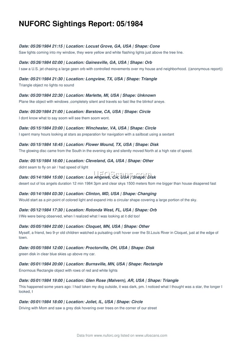 This document is a monthly log of sixteen UFO sightings reported to the National UFO Reporting Center in May 1984. It provides a brief summary of each event, including the date, location, and a short description of the observed phenomenon.