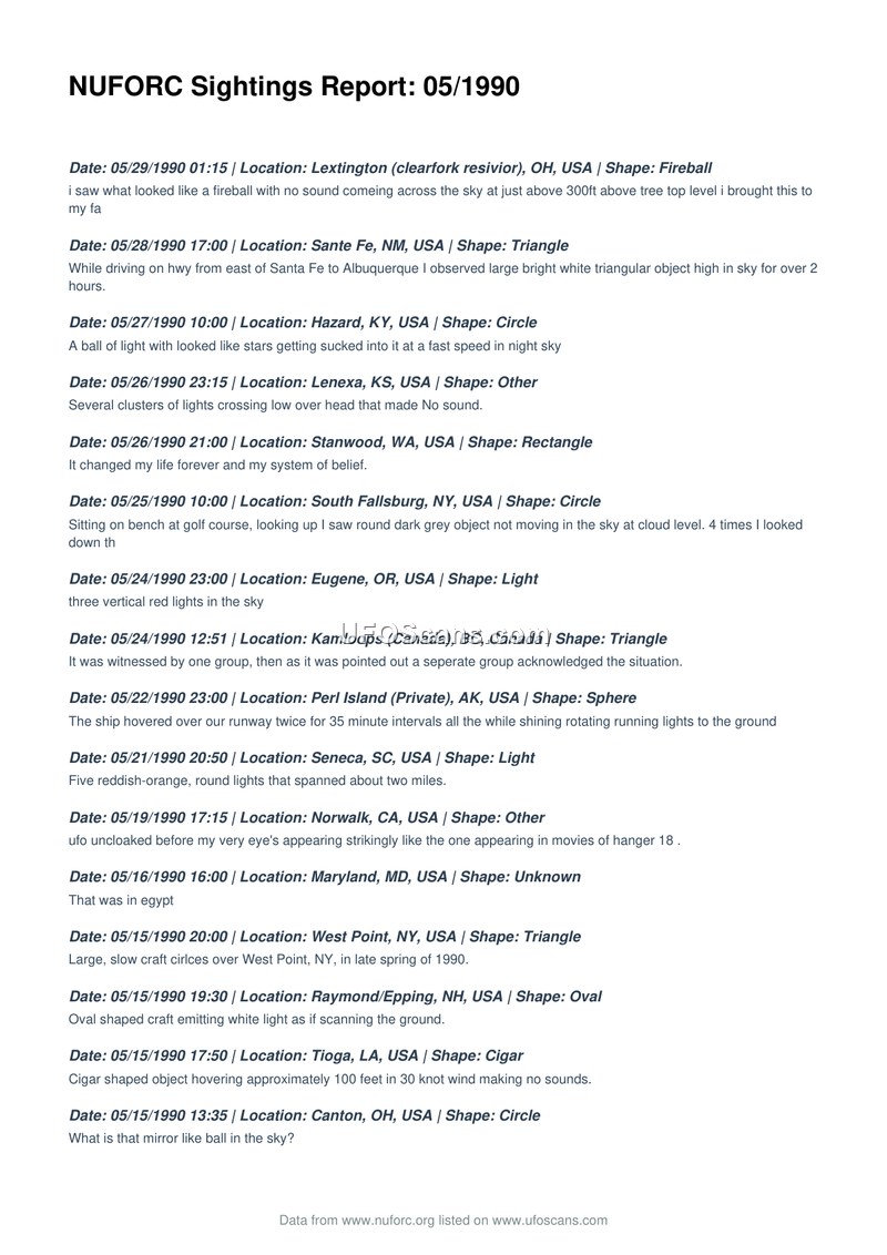 This document is a compilation of UFO sighting reports from May 1990, sourced from the National UFO Reporting Center (NUFORC). It lists twenty-two distinct incidents occurring between May 1st and May 29th, 1990. The reports span various locations, primarily within the United States, but also including sightings in Canada and Brazil. The shapes reported are diverse, including fireballs, triangles, circles, rectangles, spheres, ovals, cigars, disks, chevrons, teardrops, and unidentified lights. Witnesses describe a variety of behaviors, such as hovering, silent movement, scanning the ground, and rapid speed. Several reports mention the lack of sound associated with the objects. One witness in Norwalk, California, compared their sighting to the craft depicted in the film 'Hangar 18'. Another report from West Point, New York, notes a large, slow craft circling the area. The document serves as a chronological log of these civilian-reported events, providing dates, times, locations, and brief descriptions of the phenomena observed.