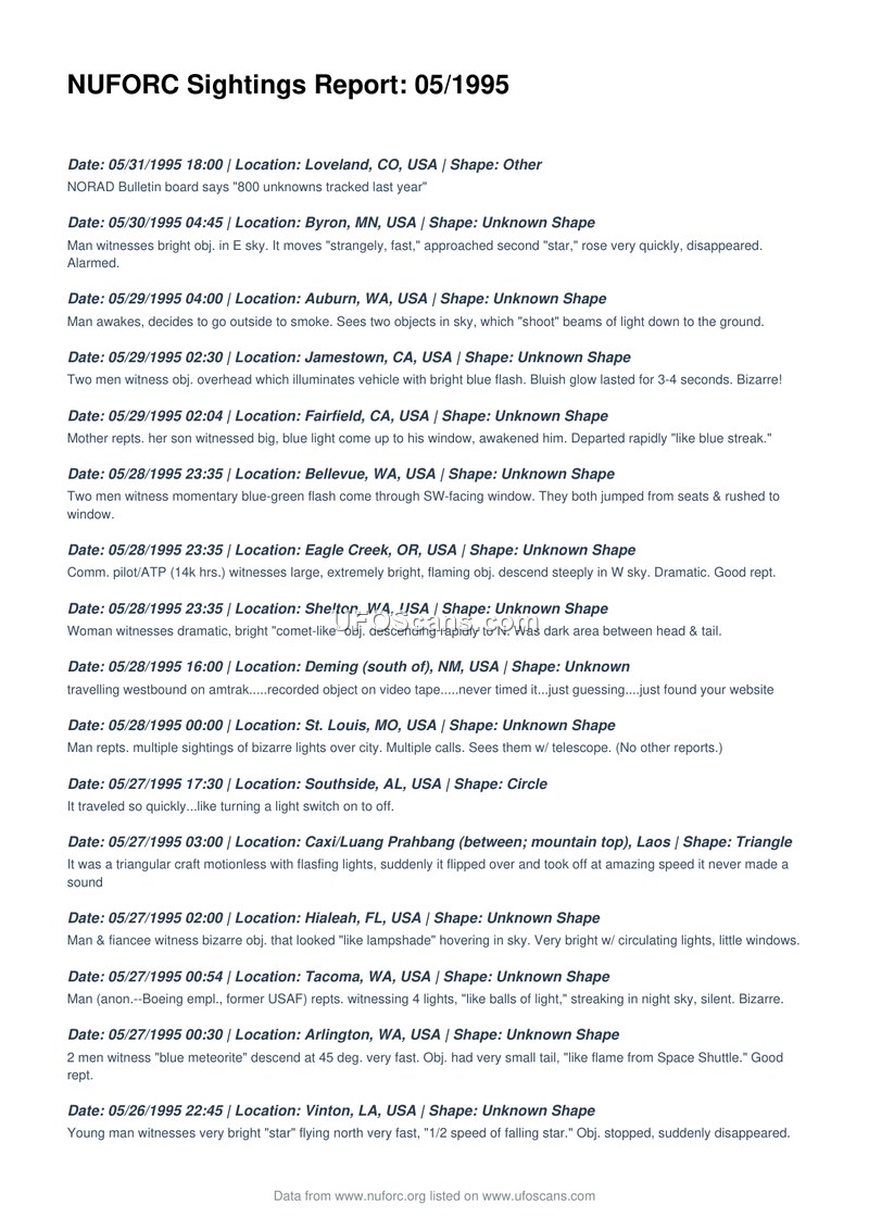 This document is a monthly log of UFO sightings reported to the National UFO Reporting Center in May 1995. It provides a chronological list of civilian observations of unidentified aerial phenomena across the globe.