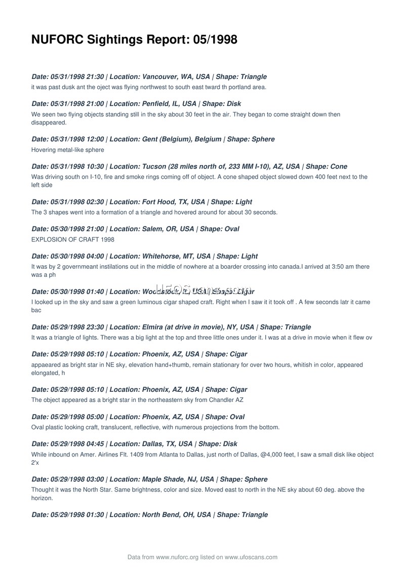 This document is a compilation of UFO sighting reports submitted to the National UFO Reporting Center (NUFORC) during the month of May 1998. The reports span a wide geographic area, including various locations across the United States, as well as international sightings in Belgium, India, Germany, the United Kingdom, Canada, Spain, and Australia. The sightings describe a diverse array of phenomena, ranging from simple lights and fireballs to complex geometric shapes such as triangles, disks, cigars, spheres, and cubes. Witnesses frequently reported anomalous flight characteristics, including sudden stops, rapid acceleration, silent movement, and unconventional maneuvers that defied standard aviation capabilities. Several reports mention interactions with or proximity to conventional aircraft, such as commercial airliners and helicopters, while others describe missing time, physical sensations, or strange sounds. The document serves as a raw data repository, capturing the subjective experiences of numerous individuals who observed unidentified aerial phenomena throughout the month.