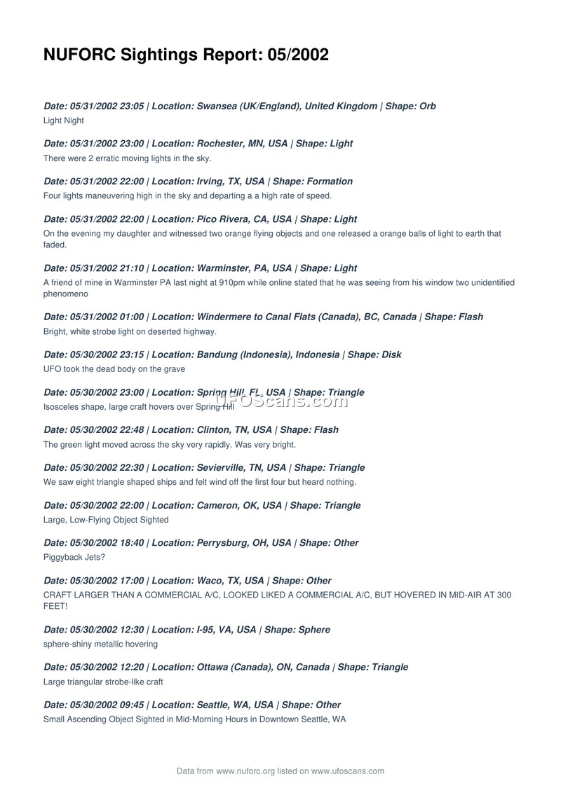 NUFORC Sightings Report: 05/2002