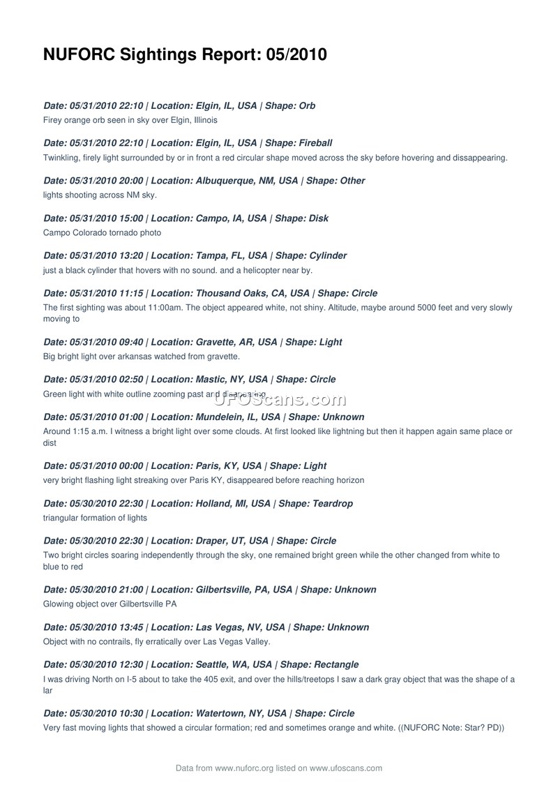 This document is a monthly compilation of hundreds of public-submitted UFO sighting reports from May 2010, categorized by date, location, and object shape. It serves as a primary record of UAP activity reported to the National UFO Reporting Center during that month.