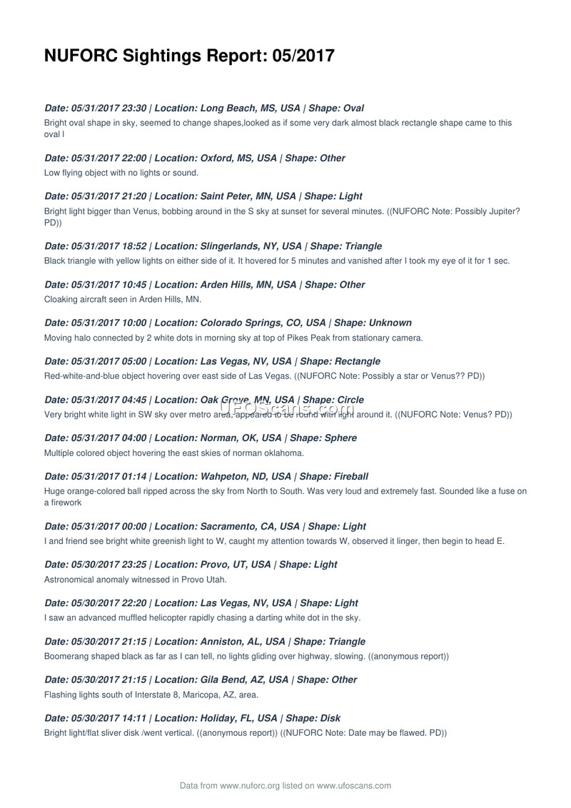 This document is a monthly compilation of public-submitted UAP sighting reports from May 2017, cataloged by the National UFO Reporting Center. It provides a diverse dataset of witness accounts, shapes, and behaviors associated with unidentified objects observed globally.