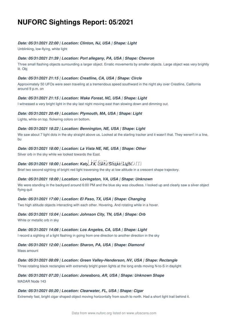 NUFORC Sightings Report: 05/2021