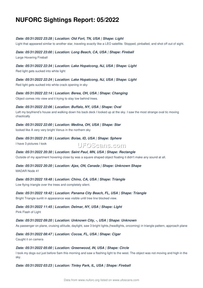 NUFORC Sightings Report: 05/2022