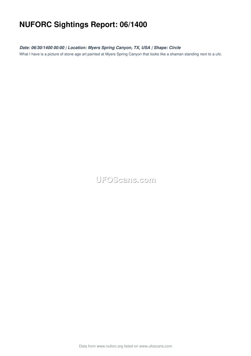 This document is a report from the National UFO Reporting Center (NUFORC) regarding a sighting or observation dated June 30, 1400. The report concerns stone age art located at Myers Spring Canyon in Texas, USA. The observer claims to possess a picture of this art, which they describe as depicting a shaman standing next to a UFO. The shape of the object is identified as a circle.