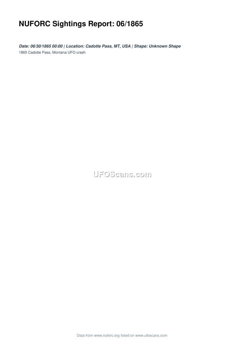 This document is a sighting report from the National UFO Reporting Center (NUFORC) regarding an incident that occurred on June 30, 1865. The report identifies the location of the event as Cadotte Pass, Montana, in the United States. The object involved in the incident is described as having an 'Unknown Shape.' The document explicitly characterizes the event as an '1865 Cadotte Pass, Montana UFO crash.'