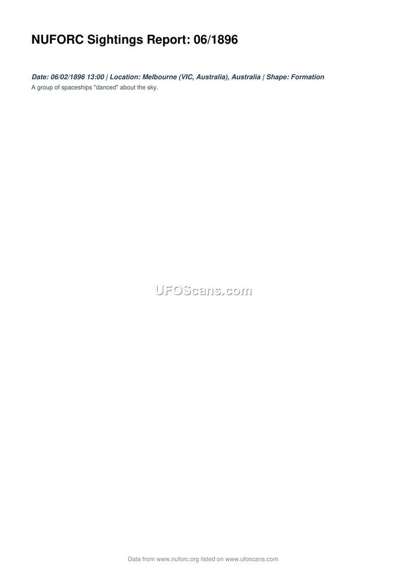 A report from the National UFO Reporting Center detailing a 1896 sighting in Melbourne, Australia, where a group of spaceships were observed in formation.