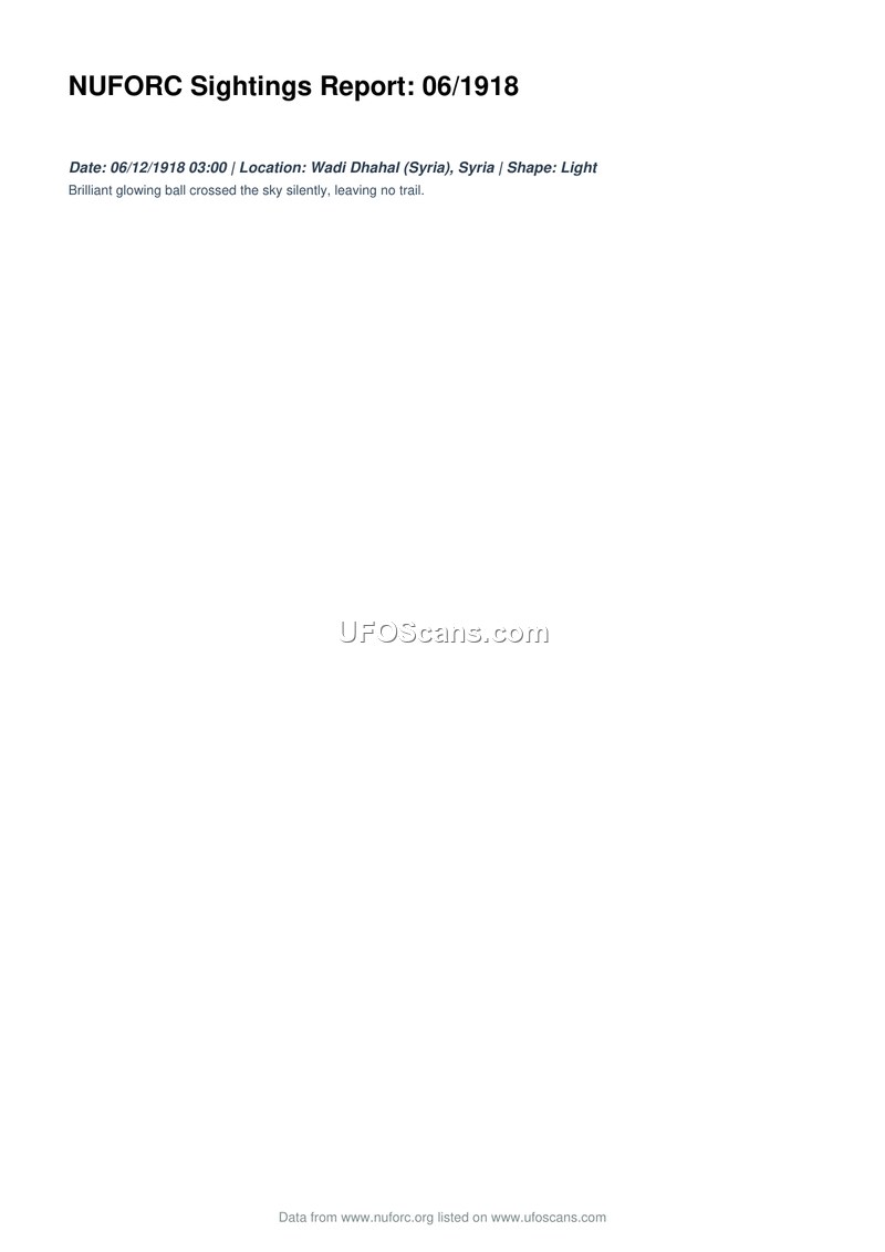 This document is a sighting report from the National UFO Reporting Center (NUFORC) detailing an event that occurred on June 12, 1918, at 03:00 in Wadi Dhahal, Syria. The report describes the observation of a brilliant, glowing ball that moved across the sky. The object was noted for its silent movement and the fact that it left no trail behind it.