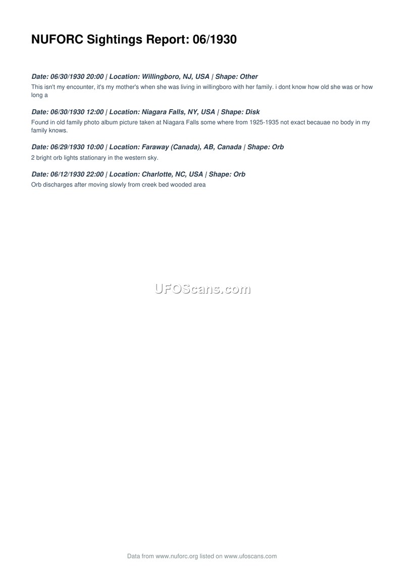 This document is a compilation of four UFO sighting reports occurring in June 1930, sourced from the National UFO Reporting Center (NUFORC). The first report, dated June 30, 1930, at 20:00, describes an encounter in Willingboro, New Jersey, involving an object of 'Other' shape, reported by the witness's mother. The second report, also dated June 30, 1930, at 12:00, concerns a disk-shaped object observed at Niagara Falls, New York, which was identified through an old family photograph taken between 1925 and 1935. The third report, dated June 29, 1930, at 10:00, describes two bright, stationary orb lights in the western sky over Faraway, Alberta, Canada. The final report, dated June 12, 1930, at 22:00, details an orb-shaped object in Charlotte, North Carolina, which was observed moving slowly from a wooded creek bed before discharging.