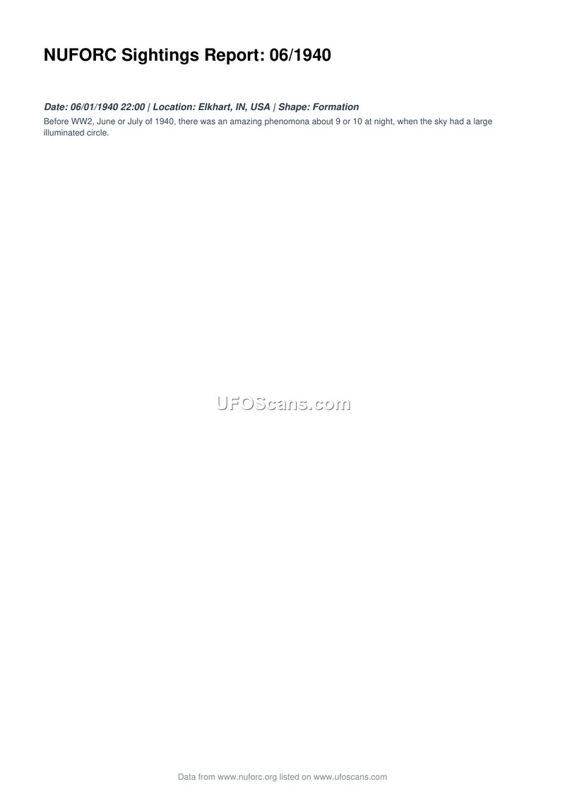This document is a sighting report from the National UFO Reporting Center (NUFORC) regarding an event that occurred in Elkhart, Indiana, in the summer of 1940. The report specifies the date as June 1, 1940, at approximately 10:00 PM. The witness describes observing an 'amazing phenomena' in the sky, characterized by a large, illuminated circle. The report notes that this event took place before the United States' entry into World War II, specifically during the months of June or July 1940.