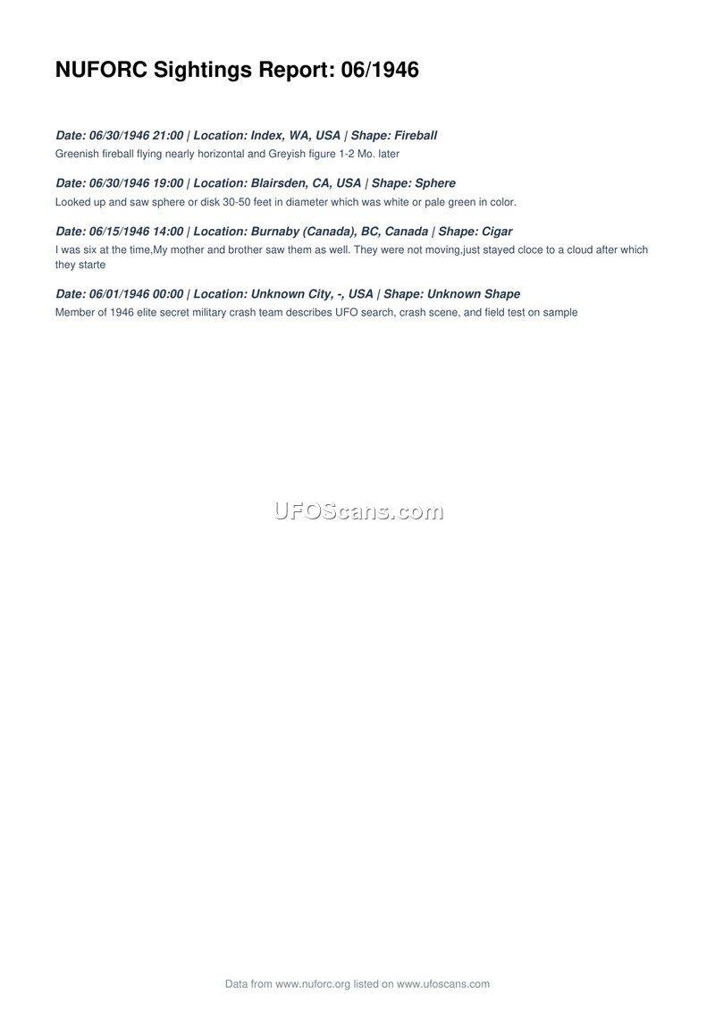 The document provides a compilation of four UFO sightings reported for the month of June 1946. The first entry, dated June 30, 1946, in Index, Washington, describes a greenish fireball flying in a nearly horizontal path, followed by a greyish figure one to two months later. The second entry, also on June 30, 1946, in Blairsden, California, reports a sphere or disk estimated at 30-50 feet in diameter, described as white or pale green. The third entry, dated June 15, 1946, in Burnaby, British Columbia, Canada, involves a cigar-shaped object observed by a witness who was six years old at the time, along with their mother and brother; the objects were stationary near a cloud. The final entry, dated June 1, 1946, in an unspecified city in the United States, mentions a member of an elite secret military crash team who describes a UFO search, a crash scene, and a field test conducted on a sample.