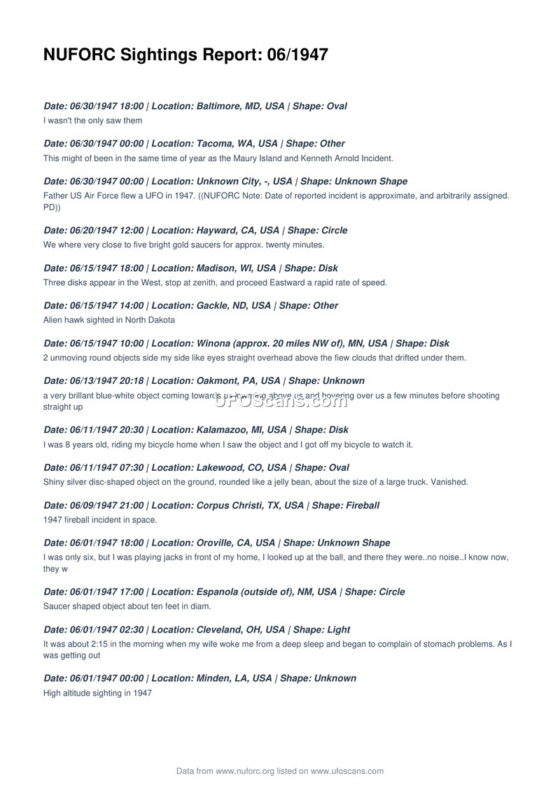 This document provides a chronological list of fifteen UFO sightings reported in the United States during June 1947. It serves as a historical record of reported aerial phenomena from that period.