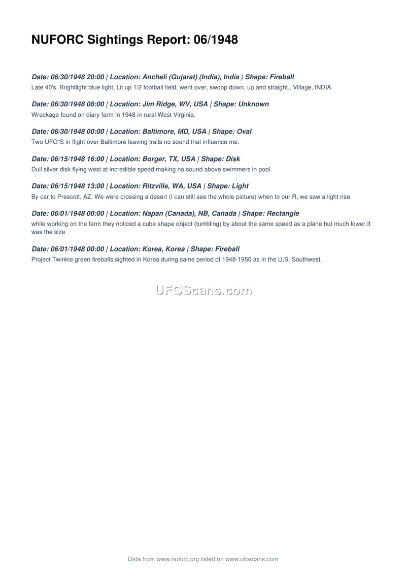 NUFORC Sightings Report: 06/1948