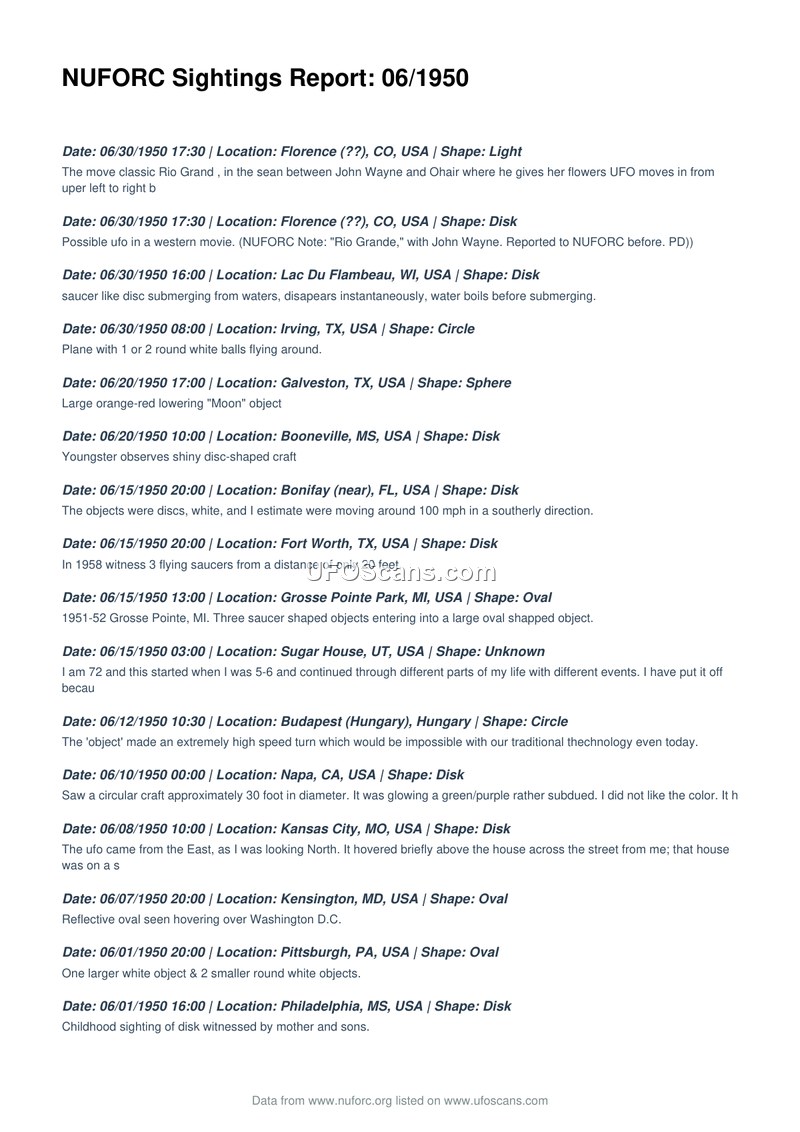 This document is a compilation of UFO sighting reports for the month of June 1950, sourced from the National UFO Reporting Center (NUFORC). The report lists various incidents across the United States, as well as one in Budapest, Hungary, and one in Mexicali, Mexico. The sightings describe a variety of objects, including disks, spheres, ovals, and lights, with behaviors ranging from hovering and high-speed maneuvers to submerging in water. Some reports involve specific witness accounts, such as a 72-year-old individual describing a lifetime of events, and a report of a 'scalded' area of cotton plants in Crowder, Mississippi, which died leaving bare dirt. The document also notes that some reports were identified as potential misidentifications, such as a UFO appearing in the movie 'Rio Grande' starring John Wayne. The reports vary in detail, with some providing specific descriptions of size, color, and movement, while others are brief accounts of childhood sightings or observations of multiple objects.