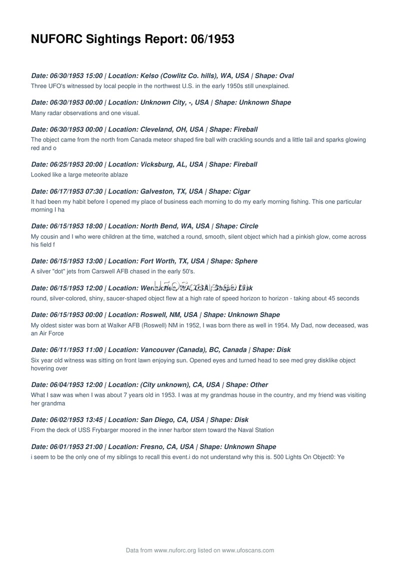 A list of thirteen UFO sightings reported in June 1953 across the U.S. and Canada. The document provides dates, locations, and brief descriptions of the observed objects.