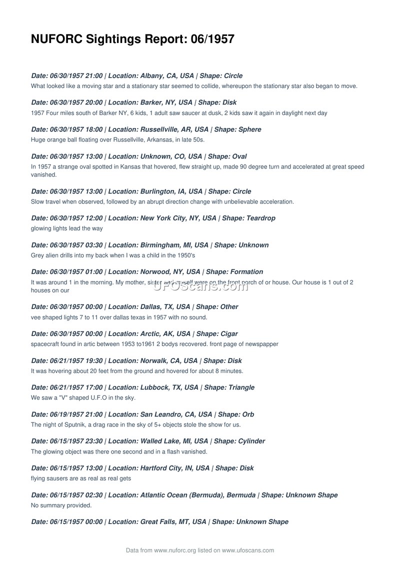 NUFORC Sightings Report: 06/1957