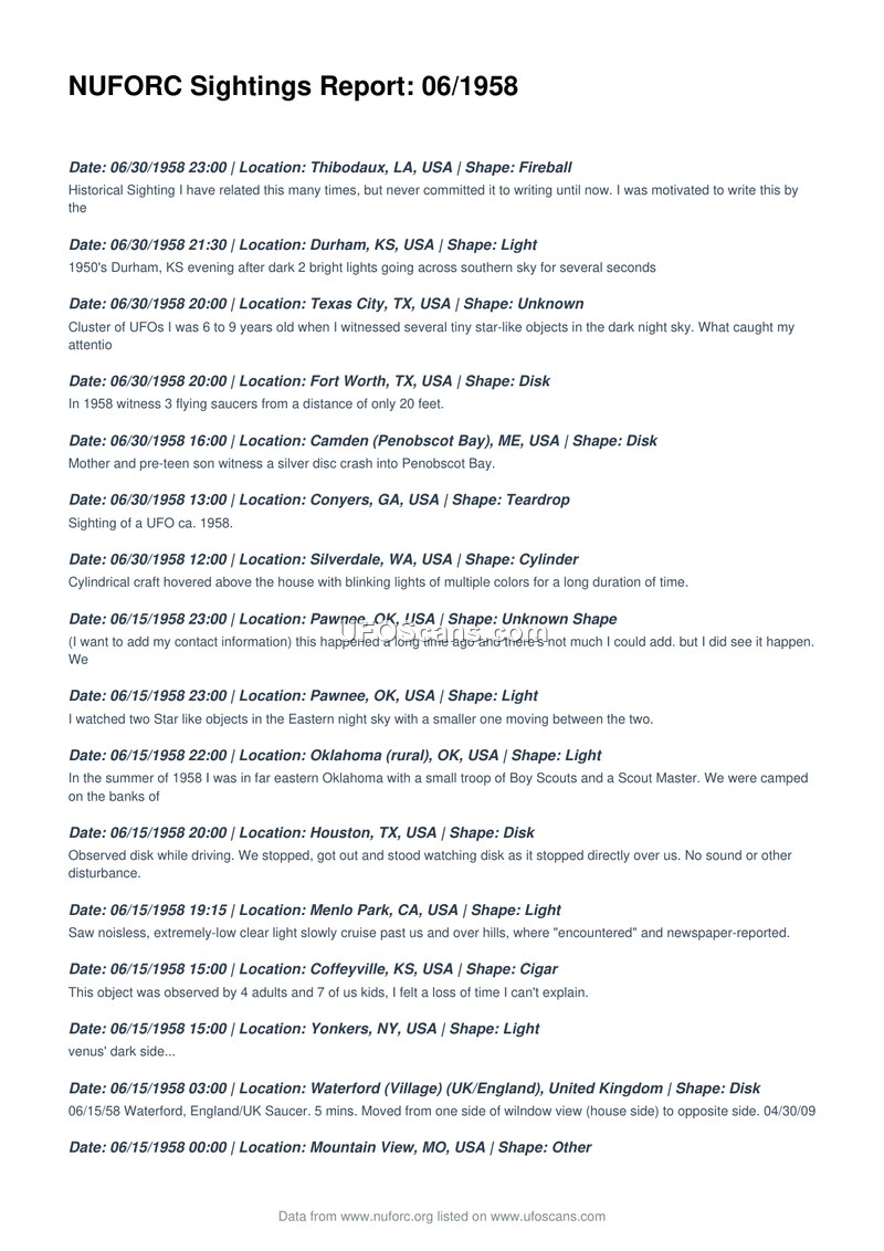 This document is a chronological list of UFO sightings reported for June 1958, compiled by the National UFO Reporting Center. It provides a summary of witness accounts involving various object shapes and locations across the US and abroad.