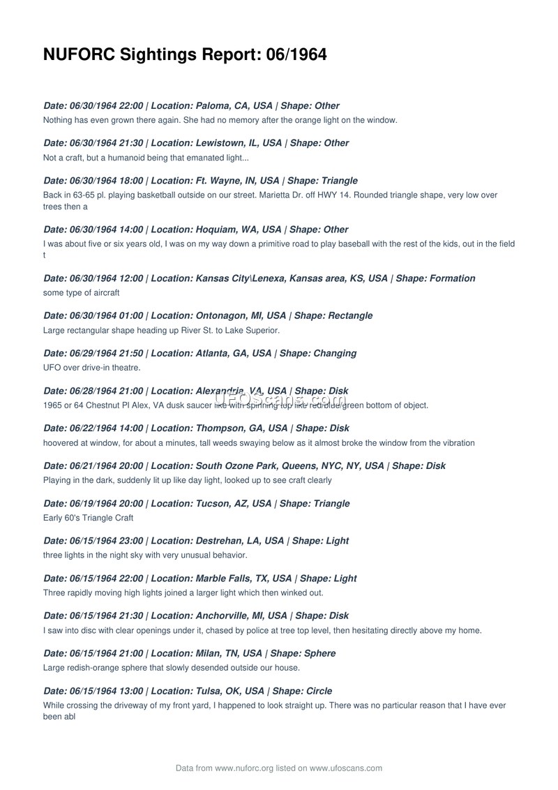 A collection of UFO sighting reports from June 1964, documenting various aerial phenomena and alleged encounters reported to the National UFO Reporting Center. The reports cover a wide geographic range and describe diverse object shapes and behaviors.