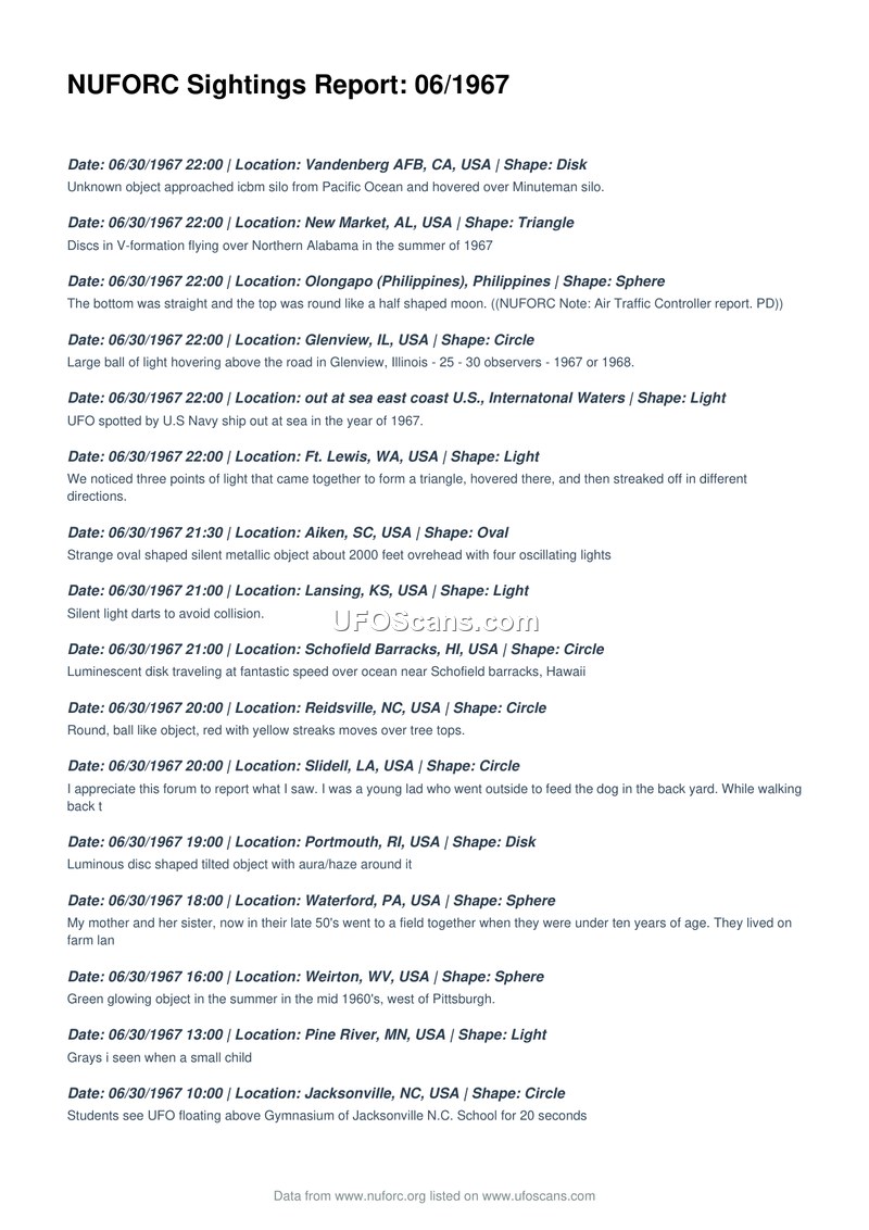 NUFORC Sightings Report: 06/1967