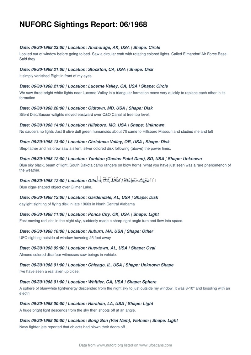 This document is a compilation of UFO sighting reports for the month of June 1968, sourced from the National UFO Reporting Center (NUFORC). The report lists numerous incidents occurring across the United States and internationally, including sightings in Vietnam, Thailand, the Dominican Republic, and Australia. The reports describe a wide variety of phenomena, ranging from circular, disk-shaped, and cigar-shaped craft to unidentified lights, spheres, and triangular objects. Many witnesses reported anomalous behaviors, such as objects moving at high speeds, making sharp turns, hovering silently, or vanishing instantly. Several reports involve military personnel or locations, including sightings near Elmandorf Air Force Base, Fort Hood, NAS Fallon, and the USS Kity Hawk aircraft carrier. Some accounts mention physical encounters or effects, such as the presence of humanoids, missing time, glowing material left behind, and electromagnetic interference. The document serves as a chronological log of these reported events, capturing the diverse and often unexplained nature of the sightings as experienced by the public and military personnel during that period.
