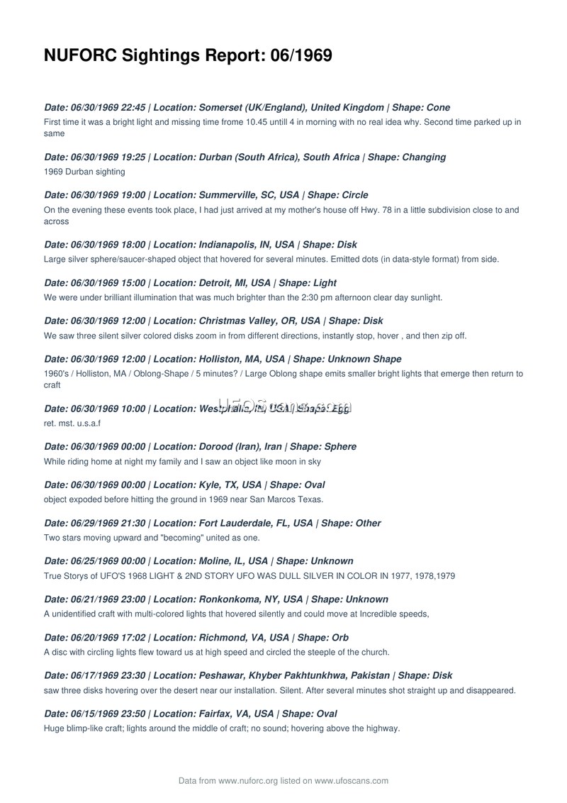 This document is a compilation of UFO sighting reports from June 1969, sourced from the National UFO Reporting Center (NUFORC). The report lists numerous individual accounts spanning various global locations, including the United States, the United Kingdom, South Africa, Iran, Pakistan, Costa Rica, Italy, Canada, and Puerto Rico. The sightings describe a wide variety of aerial phenomena, ranging from disks, spheres, and triangles to oblong shapes, lights, and formations. Witnesses reported diverse behaviors, such as silent hovering, rapid acceleration, erratic movement, and, in some instances, interaction with the environment or observers. Several reports mention specific details like metallic surfaces, multicolored lights, and sounds, such as whistling. Some accounts include anecdotal context, such as missing time, potential abductions, or observations made by military personnel on duty. The document serves as a chronological record of public-submitted reports regarding unidentified aerial phenomena during that month.