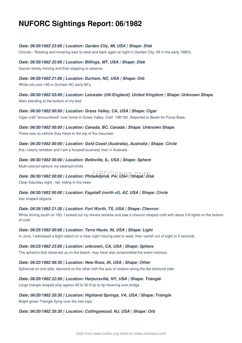 This document is a collection of civilian UFO sighting reports from June 1982, cataloged by the National UFO Reporting Center. It details various aerial phenomena observed globally, including descriptions of craft shapes, behaviors, and witness experiences.