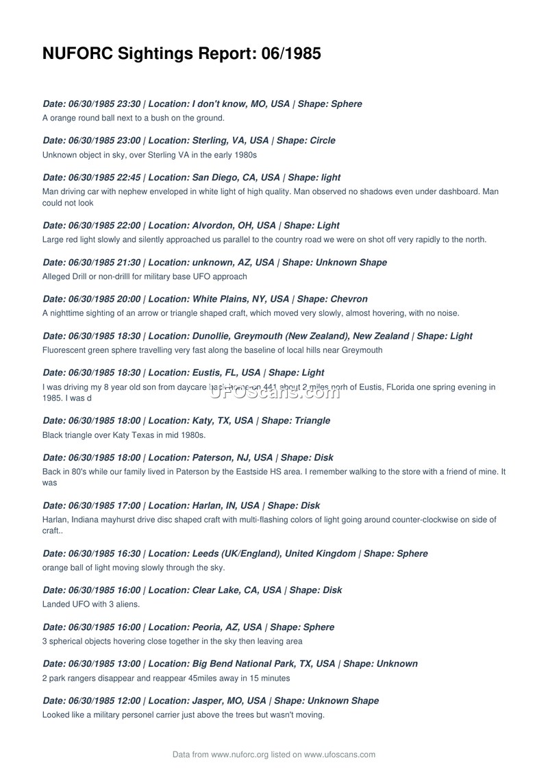 This document is a compilation of UFO sighting reports for the month of June 1985, sourced from the National UFO Reporting Center (NUFORC). The reports span a wide geographic range, including sightings across the United States, Canada, the United Kingdom, Ireland, Mexico, South Africa, Thailand, South Korea, and Croatia. The sightings describe a diverse array of phenomena, including spheres, disks, triangles, ovals, cigars, and various unidentified light formations. Many reports detail specific behaviors such as hovering, rapid movement, silent flight, and, in some instances, interactions with witnesses or technology, such as vehicle power failures or animal agitation. Several entries mention specific locations like military bases, national parks, and residential areas. The reports are presented chronologically, beginning with sightings on June 30 and concluding with reports from June 1. The document serves as a raw data repository for these accounts, providing brief descriptions of the events as reported by the witnesses.