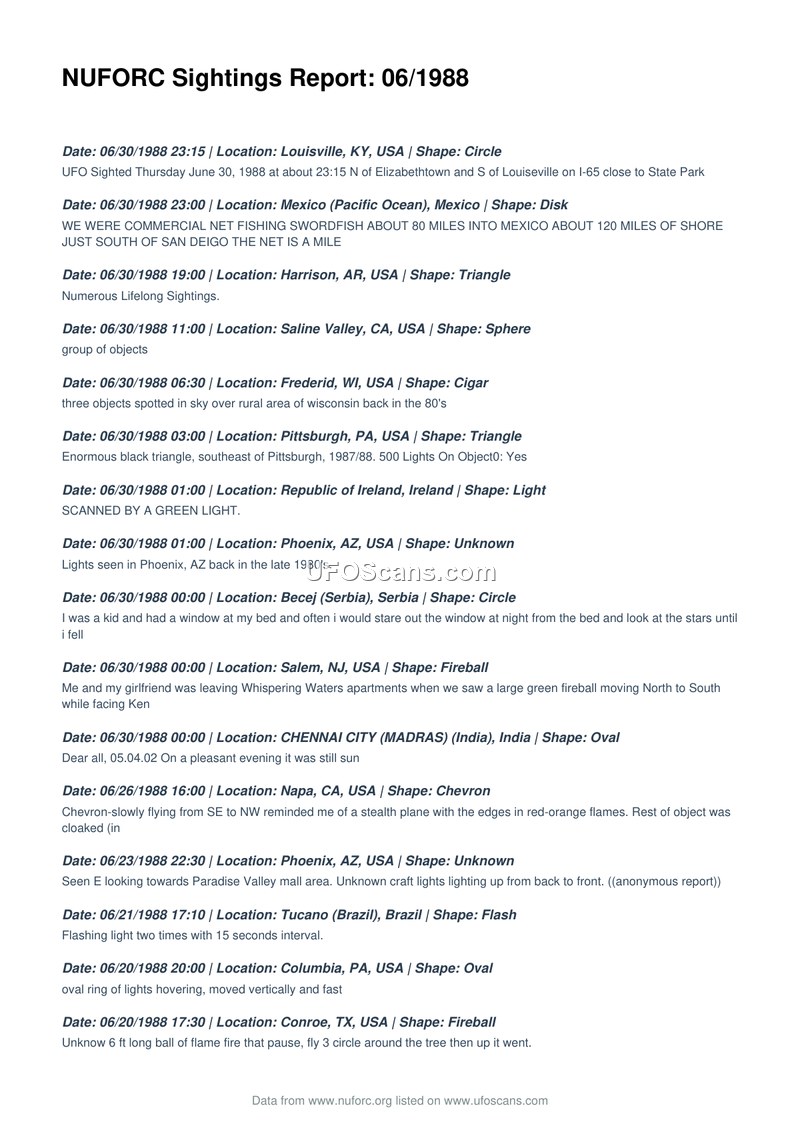 This document is a compilation of UFO sighting reports submitted to the National UFO Reporting Center (NUFORC) for the month of June 1988. The report lists numerous individual accounts from various locations globally, including the United States, Brazil, Australia, Serbia, India, Ireland, Germany, and Venezuela. The sightings describe a wide variety of phenomena, including objects shaped like disks, triangles, spheres, cigars, fireballs, and other unidentified forms. Witnesses report diverse experiences, ranging from simple observations of lights in the sky to more complex encounters involving hovering craft, rapid movement, and, in some instances, claims of abduction or missing time. The reports are presented chronologically, beginning with June 30, 1988, and extending back to June 1, 1988. The descriptions provided by the witnesses vary in detail, with some reports noting specific behaviors such as silent flight, sudden turns, or the emission of light, while others are brief, anecdotal accounts. The document serves as a historical record of public reports collected by the NUFORC during this period.