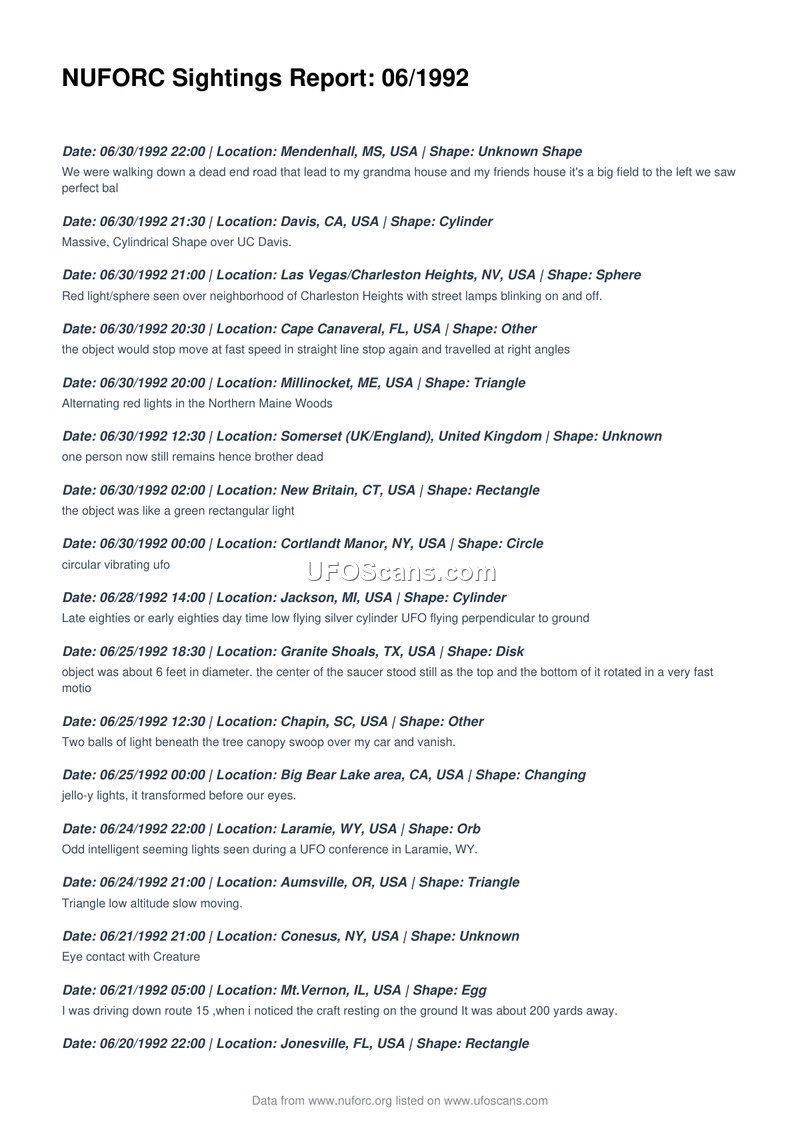 This document is a chronological list of UFO sightings reported to the National UFO Reporting Center during June 1992. It serves as a historical record of public accounts of unidentified aerial phenomena from various global locations.