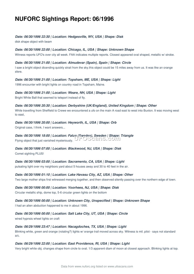 This document is a compilation of UFO sighting reports submitted to the National UFO Reporting Center (NUFORC) for the month of June 1996. The reports span a wide geographic area, including the United States, Canada, the United Kingdom, Spain, Sweden, Australia, the Philippines, Bangladesh, and the Netherlands. The sightings describe a diverse array of phenomena, ranging from simple lights in the sky to complex, structured craft. Common shapes reported include disks, triangles, spheres, ovals, and various 'unknown' or 'other' configurations. Many witnesses describe anomalous flight characteristics, such as rapid acceleration, sudden disappearance, hovering, and silent movement. Some reports mention specific details like blinking lights, metallic surfaces, or the presence of multiple objects in formation. Several entries involve reports from military personnel or police officers, and some accounts include claims of close encounters, such as an alleged alien abduction, craft landings, or objects interacting with the environment. The document serves as a raw data log of public reports and does not provide official investigations or conclusions for the individual events listed.