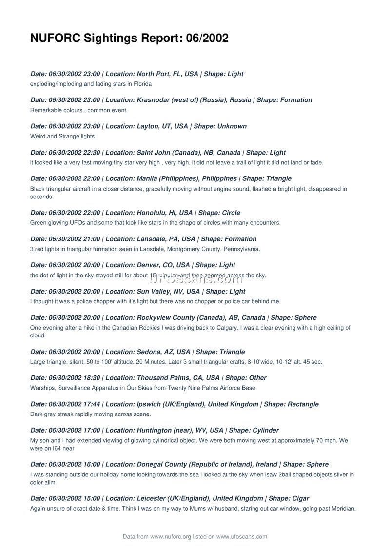 This document is a comprehensive compilation of Unidentified Aerial Phenomena (UAP) sighting reports submitted to the National UFO Reporting Center (NUFORC) during the month of June 2002. The report consists of a chronological list of entries, detailing sightings from across the globe, including the United States, Canada, the United Kingdom, Australia, Sri Lanka, and various other nations. Each entry provides the date, time, location, and a brief description of the object's shape and the witness's experience. The reported phenomena vary significantly in description, ranging from simple lights and orbs to complex geometric shapes such as triangles, disks, cigars, and spheres. Witness accounts frequently describe unusual flight characteristics, including silent movement, rapid acceleration, hovering, and sudden changes in direction or color. Some reports mention interactions with military aircraft, such as jets being scrambled or objects being pursued. Other entries include reports of physical or physiological experiences, such as missing time, buzzing sensations, or encounters with entities. The document serves as a raw data repository for public reports, with some entries containing notes from NUFORC staff regarding the credibility or nature of the report, such as potential misidentifications of birds or satellites. The document reflects a wide spectrum of public perception and observation regarding aerial anomalies during this period.