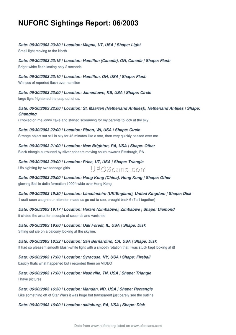 This document is a comprehensive compilation of UFO and UAP sighting reports submitted to the National UFO Reporting Center (NUFORC) during the month of June 2003. The report spans 19 pages and catalogs hundreds of individual accounts from witnesses across the globe, including the United States, Canada, the United Kingdom, Australia, New Zealand, Greece, Italy, France, Spain, South Africa, and others. The sightings are presented in reverse chronological order, beginning with reports from June 30, 2003, and concluding with reports from June 1, 2003. The descriptions provided by witnesses are highly varied, encompassing a wide range of shapes, including disks, spheres, triangles, cigars, fireballs, rectangles, chevrons, and various unidentified lights. Witness accounts frequently describe anomalous behaviors such as rapid acceleration, sudden changes in direction, hovering, silent flight, and unusual light patterns. Several reports mention the presence of military aircraft, including sightings near Hill Air Force Base and Naval Air Station Lemoore, or instances where military helicopters were observed in proximity to the objects. Some witnesses reported physical or psychological effects, such as missing time, feelings of being watched, or the observation of entities. The document also notes instances where photographic or video evidence was claimed to have been captured, and references other organizations such as HBCCUFO and MUFON in relation to specific reports. The tone of the entries varies from objective descriptions of aerial phenomena to personal anecdotes, including reports of potential hoaxes or misidentifications, such as spotlights or astronomical objects. The compilation serves as a raw data repository for public reports of aerial anomalies during this specific timeframe, reflecting the diverse and often subjective nature of civilian UFO reporting at the time.