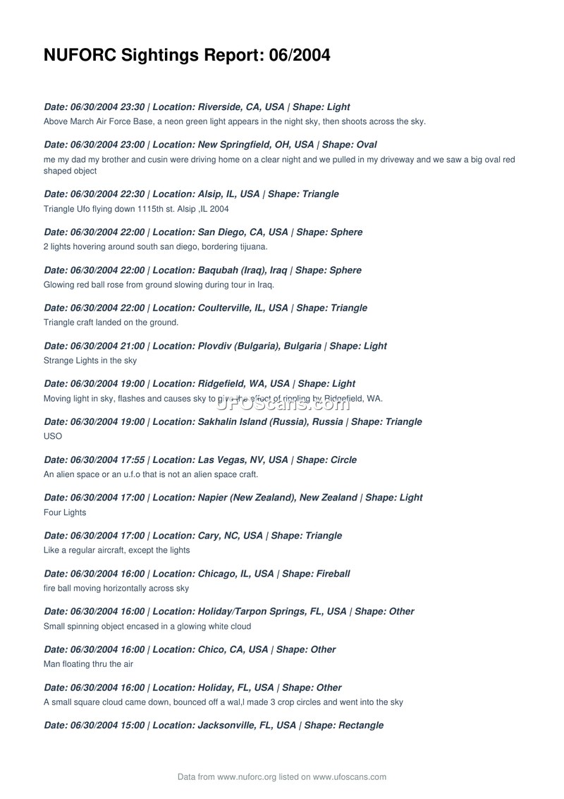 This document is a comprehensive compilation of Unidentified Aerial Phenomena (UAP) sighting reports submitted to the National UFO Reporting Center (NUFORC) for the month of June 2004. The reports span a global range, with significant activity noted across the United States, Canada, Portugal, and various other international locations. The sightings are presented in reverse chronological order, beginning with reports from June 30, 2004, and concluding with those from June 1, 2004. The descriptions provided by witnesses are highly varied, encompassing a wide array of shapes, including lights, spheres, triangles, disks, cigars, and other anomalous forms. Witness accounts frequently describe erratic flight patterns, high speeds, sudden changes in direction, and hovering behaviors. Some reports include specific details such as the presence of smoke trails, metallic surfaces, or the absence of sound. Several entries mention the involvement of other organizations, such as MUFON or the Missouri Investigators Group, and some reports note the capture of photographic or video evidence. Notably, the document includes editorial notes from NUFORC regarding potential explanations for certain sightings, such as space debris, re-entering satellites, flares, or astronomical phenomena like Venus or Jupiter. Some reports are explicitly flagged as potential hoaxes or misidentifications, such as the 'red rain' event in India or various 'dramatic meteor' sightings. The document serves as a raw data repository of public-submitted accounts, reflecting the diverse and often subjective nature of UAP reporting during this period.