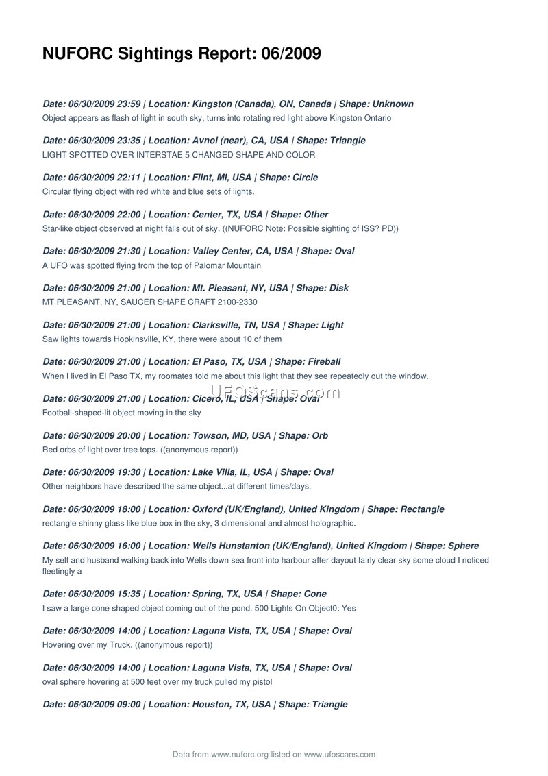 This document is a comprehensive compilation of Unidentified Aerial Phenomena (UAP) sighting reports submitted to the National UFO Reporting Center (NUFORC) for the month of June 2009. The report spans 24 pages and lists hundreds of individual accounts from witnesses across the United States, Canada, the United Kingdom, and several other international locations. The entries are organized chronologically, beginning with reports from June 30, 2009, and extending back through the month. Each entry provides the date, time, location, and the reported shape of the object, followed by a brief narrative description provided by the witness. The shapes reported are highly varied, including triangles, circles, orbs, disks, cigars, fireballs, and various unidentified light phenomena. Many witnesses describe objects that hover, move at high speeds, change shape or color, or perform erratic maneuvers. Some reports include specific details such as the object being silent, emitting lights, or interacting with the environment, such as hovering over vehicles or near power lines. The document also includes occasional notes from NUFORC staff, which offer potential explanations for certain sightings, such as the International Space Station (ISS), stars, planets, or Iridium satellite flares. Several reports mention the use of technology to document the events, including photography and video capture. The narratives reflect a wide range of witness experiences, from casual observers to individuals who claim to have had more profound or unsettling encounters. The document serves as a raw data repository for public reports of anomalous aerial activity during this specific timeframe, capturing the diverse and often subjective nature of UAP reporting.