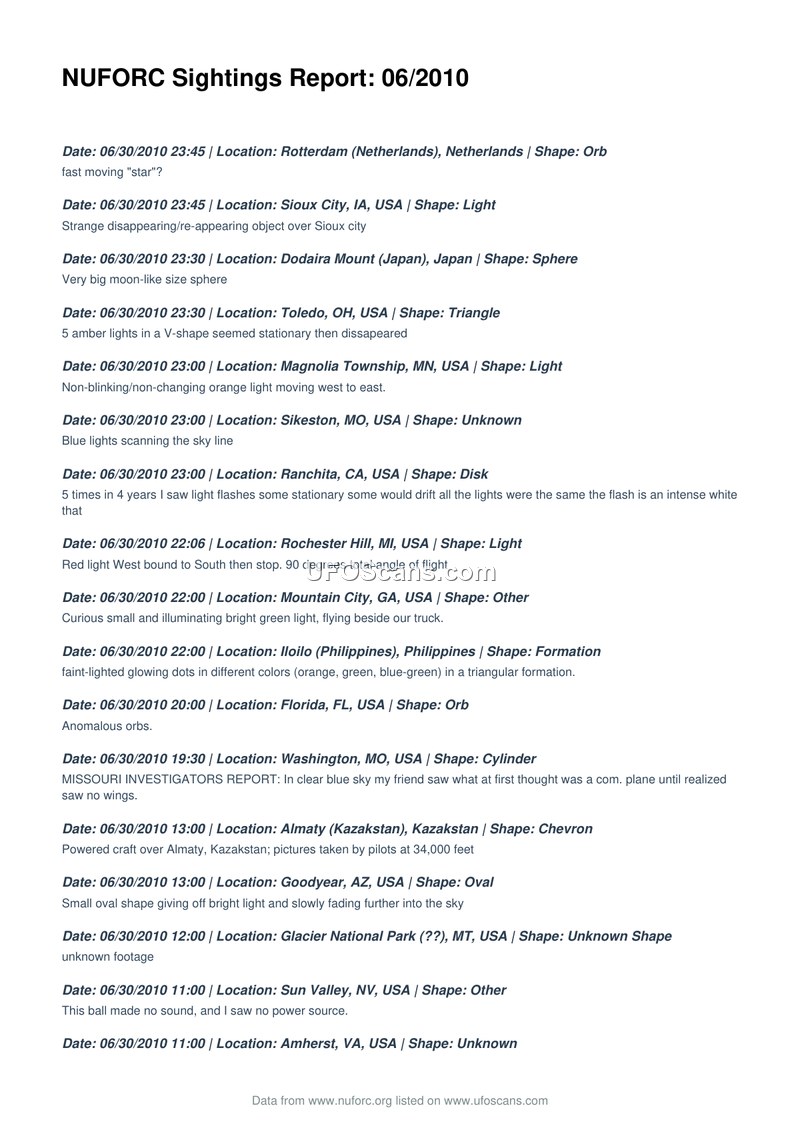 This document is a chronological log of hundreds of UFO sighting reports submitted to the National UFO Reporting Center during June 2010. It provides a global snapshot of witness accounts describing various shapes, behaviors, and characteristics of unidentified aerial phenomena.