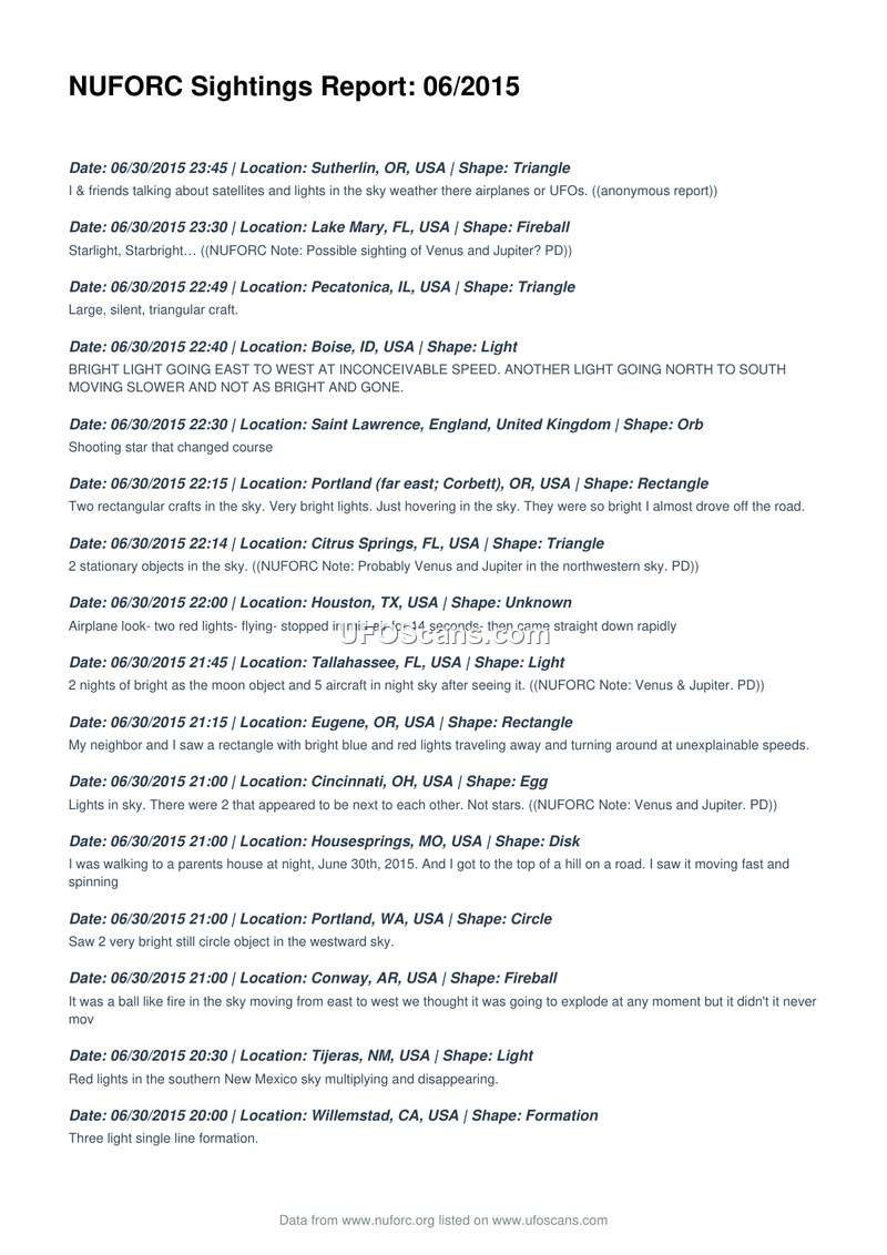 This document is a comprehensive compilation of Unidentified Aerial Phenomena (UAP) sighting reports submitted to the National UFO Reporting Center (NUFORC) during the month of June 2015. The report spans 30 pages and details hundreds of individual accounts from witnesses across the United States, Canada, and several international locations including the United Kingdom, India, Australia, and Turkey. The sightings are presented in chronological order, beginning on June 30, 2015, and extending back through the month to June 1, 2015. Each entry provides the date, time, location, and the reported shape of the object. The descriptions of the phenomena are highly varied, ranging from simple lights and fireballs to complex geometric shapes such as triangles, disks, cylinders, and formations. Many reports include brief narrative descriptions from the witnesses, detailing behaviors such as hovering, rapid movement, sudden changes in direction, and unusual light patterns. In several instances, the NUFORC has appended notes to specific reports, offering potential explanations for the sightings, such as the planets Venus and Jupiter, satellite re-entry events, lens flares, or advertising lights. The document serves as a raw data repository for public-submitted reports, capturing the diverse nature of UAP observations reported to the organization during this specific timeframe. The reports reflect a wide spectrum of witness experiences, from casual observations of lights in the sky to more detailed accounts of structured craft and anomalous aerial behavior.