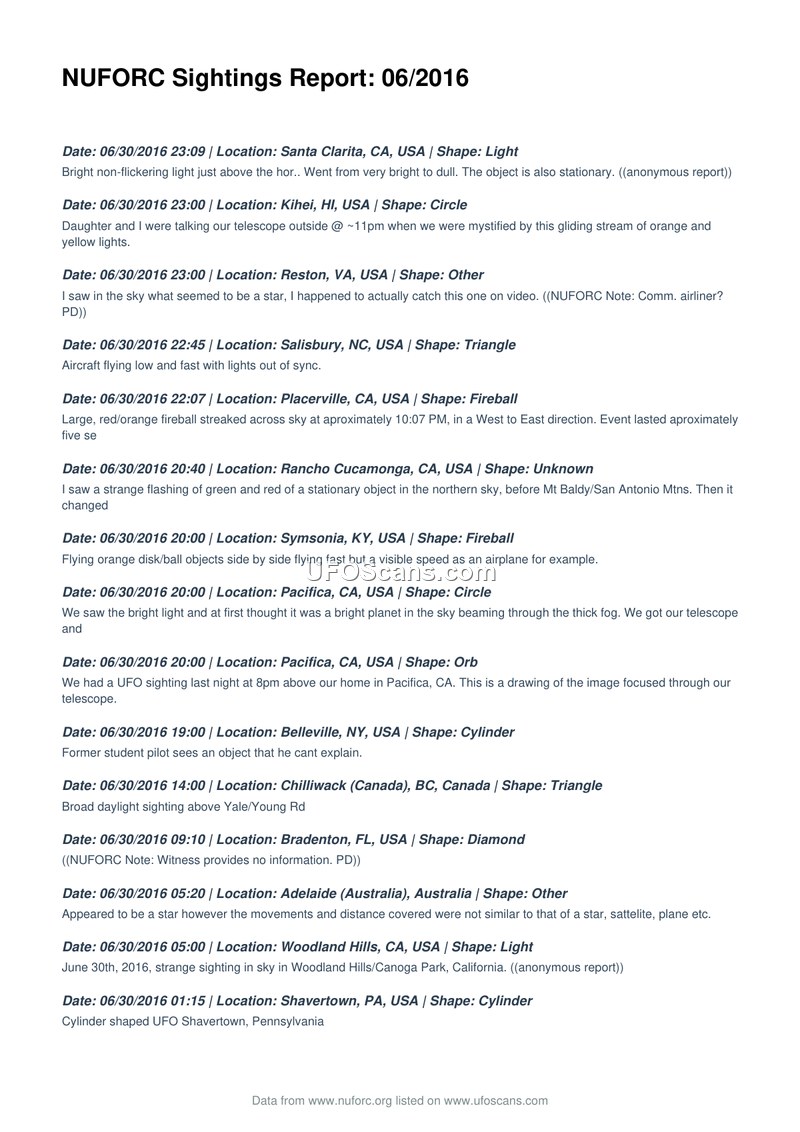 This document is a comprehensive compilation of Unidentified Aerial Phenomena (UAP) sighting reports collected by the National UFO Reporting Center (NUFORC) for the month of June 2016. The report consists of 27 pages of individual entries, each detailing a specific sighting event. Each entry typically includes the date and time of the incident, the location (city, state/province, and country), and the reported shape of the object. The descriptions provided by witnesses vary significantly, ranging from simple light observations to complex craft descriptions. Common shapes reported include circles, orbs, triangles, cylinders, fireballs, rectangles, and disks. Many reports describe objects that exhibit unusual flight characteristics, such as erratic movement, high-speed maneuvers, hovering, or sudden disappearance. Some witnesses reported seeing multiple objects in formation, while others described single objects. Several entries include brief notes from NUFORC, which occasionally suggest potential explanations such as commercial airliners, camera lens flares, or meteors, though many reports remain unclassified. The geographic scope of these sightings is extensive, covering numerous locations across the United States, as well as reports from Canada, Australia, the United Kingdom, Argentina, Colombia, Kenya, the Philippines, Portugal, India, and New Zealand. The document serves as a raw data repository for public-submitted accounts of aerial anomalies during this specific timeframe, reflecting a wide variety of witness experiences and interpretations.