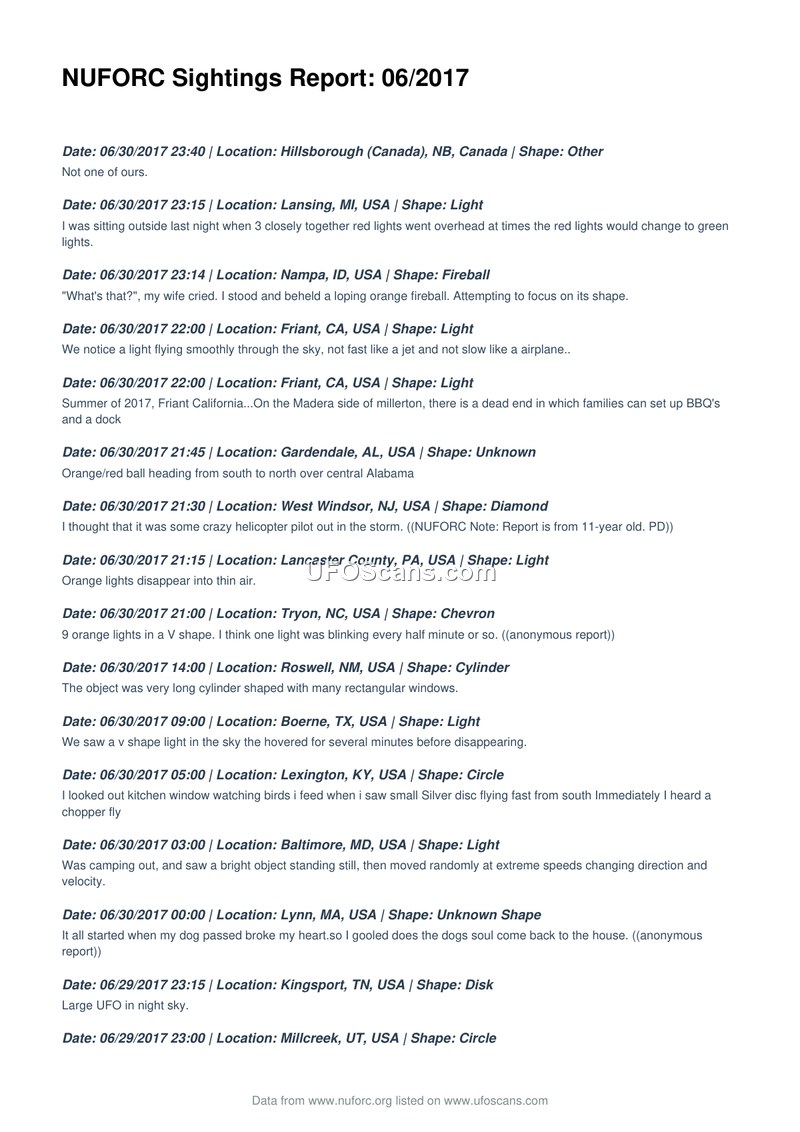 This document is a chronological compilation of hundreds of public UFO sighting reports submitted to the National UFO Reporting Center (NUFORC) during June 2017. It documents a wide variety of aerial phenomena reported globally, with some entries including internal notes regarding potential conventional explanations.