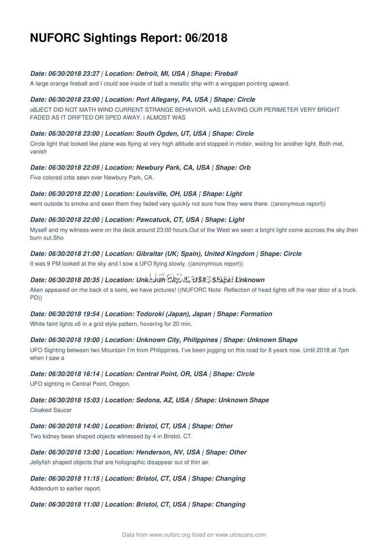 NUFORC Sightings Report: 06/2018